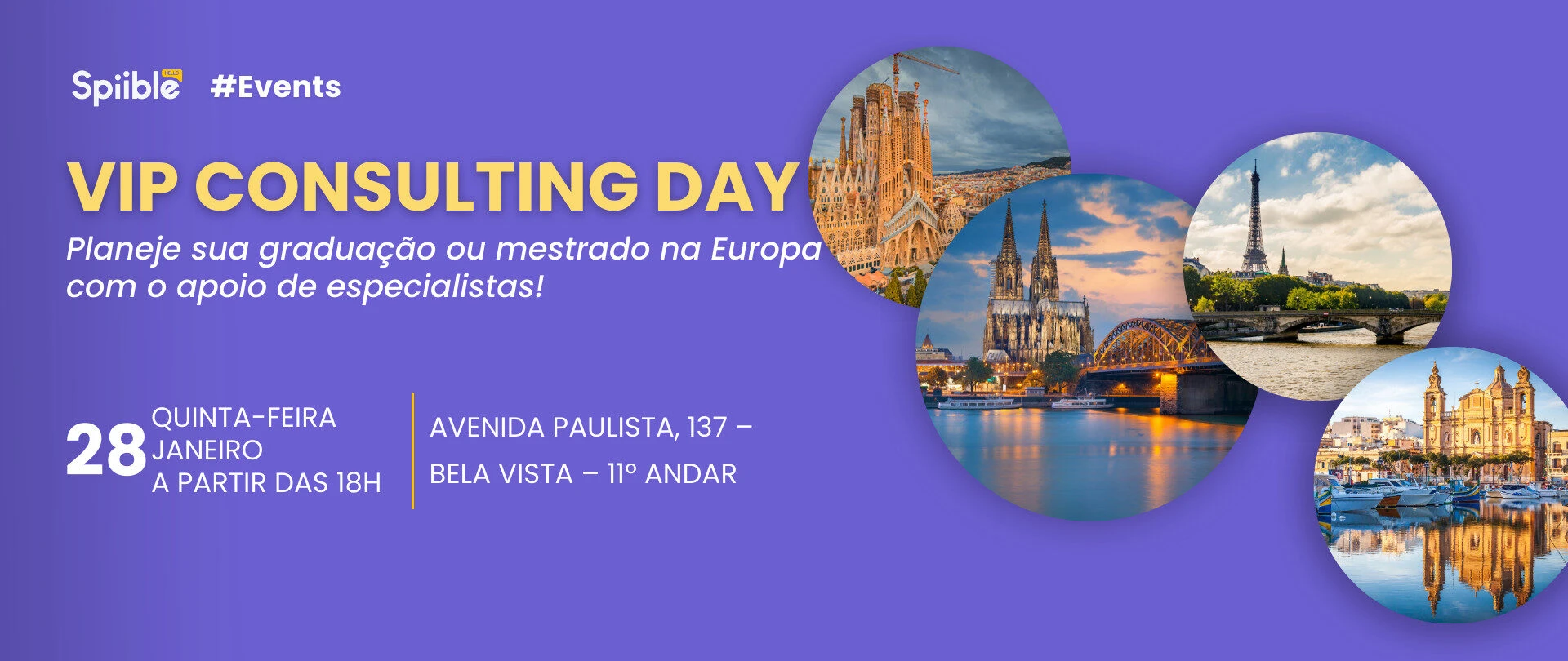 No dia 28 de janeiro, a Spiible realiza o VIP Consulting Day, um evento presencial exclusivo, em parceria com a GEDU, pensado para quem deseja estudar na Europa e busca um planejamento acadêmico estratégico e personalizado.